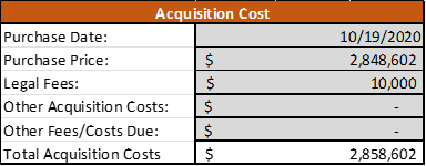 We like to use leverage to (hopefully) amplify our returns. Remember, leverage cuts both ways, so you have to be careful. We utilize a warehouse line to purchase non-performing loans. Put simply, we borrow money from another lender, typically a bank, to fund the note purchases. The lender will fund up to 60% of the note acquisition cost. They charge Prime plus 1% and require 12 months of interest to be held back at closing. Therefore, the lender funded the following at note acquisition: