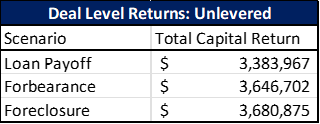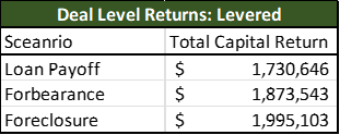 Before you continue reading, stop and think about the outcomes under the three scenarios: loan payoff, forbearance, and foreclosure. Then move on to comparing them with and without leverage. What standouts?