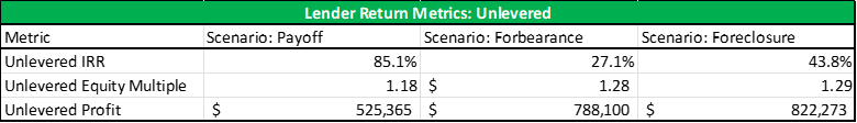 Although the levered deal profit is lower under each scenario, our IRR and equity multiple improved. This is a function of having less of our cash invested in the deal and leverage being beneficial. The danger of using leverage on an NPL is the unpredictability of exiting the investment. In this deal, leverage was beneficial because we were paid off quickly. However, it could have dragged on for a substantial amount of time. For example,